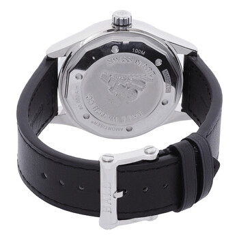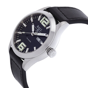 Silver-tone stainless steel case with a black leather strap. Fixed silver-tone stainless steel bezel. Black dial with silver-tone hands and Arabic numeral-index hour markers. Minute scale around the inner rim. Dial Type: Analog. Luminescent hands and markers. Day and date display at the 3 o'clock position. BALL Calibre RR1102 Automatic movement, based upon ETA 2836-2, containing 25 Jewels, bitting at 28800 vph, and has a power reserve of approximately 38 hours. Scratch resistant sapphire crystal. Screw down crown. Round case shape, case size: 40 mm, case thickness: 13.6 mm. Buckle clasp. Water resistant at 100 meters / 330 feet. Functions: date, day, hour, minute, second. Engineer IIi Series. Sport watch style. Watch label: Swiss Made. Ball Engineer III Automatic Black Dial Men's Watch NM2026C-L12A-BK.