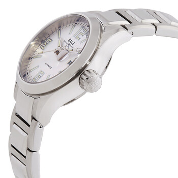 Silver-tone stainless steel case and bracelet. Fixed silver-tone stainless steel bezel. Silver dial with silver-tone hands and Arabic numeral-index hour markers. Minute markers around the outer rim. Dial Type: Analog. Luminescent hands and markers. Date display at the 3 o'clock position. RR1104 automatic movement with a 38-hour power reserve. Scratch resistant sapphire crystal. Screw down crown. Round case shape, case size: 31 mm, case thickness: 10.70 mm. Band width: 16 mm. Folding clasp. Water resistant at 100 meters / 330 feet. Functions: date, hour, minute, second. Engineer IIi Series. Dress watch style. Watch label: Swiss Made. Ball Engineer III Automatic Silver Dial Ladies Watch NL1026C-S4A-SLGR.