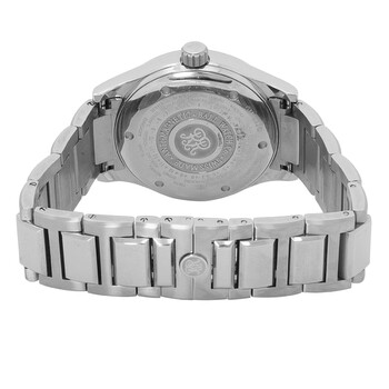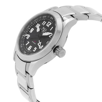 Silver-tone stainless steel case and bracelet. Fixed silver-tone stainless steel bezel. Black dial with silver-tone hands and Arabic numeral hour markers. Minute markers around the outer rim. Dial Type: Analog. Date display at the 3 o'clock position. Ball Calibre RR1201 Automatic movement, containing 21 Jewels, bitting at 28800 vph, and has a power reserve of approximately 42 hours. Scratch resistant sapphire crystal. Solid case back. Round case shape, case size: 40 mm. Fold over clasp with a safety release. Water resistant at 100 meters / 330 feet. Functions: date, GMT, second time zone, hour, minute, second, shock resistant. Engineer IIi Series. Sport watch style. Watch label: Swiss Made. Ball Engineer III GMT Automatic Black Dial Men's Watch GM1032C-S3-BK.