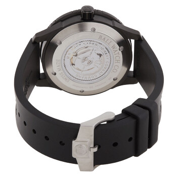 Black stainless steel case with a black rubber strap. Uni-directional rotating black stainless steel bezel. Black dial with silver-tone hands and index hour markers. Minute markers around the outer rim. Dial Type: Analog. Luminescent hands and markers. Date display at the 3 o'clock position. BALL Calibre RR1103 Automatic movement, based upon ETA 2824-2, containing 25 Jewels, bitting at 28800 vph, and has a power reserve of approximately 38 hours. Scratch resistant sapphire crystal. Screw down crown. Transparent see through case back. Round case shape, case size: 40.5 mm, case thickness: 13 mm. Buckle clasp. Water resistant at 300 meters / 1000 feet. Functions: date, hour, minute, second. Fireman Series. Sport watch style. Watch label: Swiss Made. Ball Fireman Automatic Black Dial Men's Watch DM3090A-P10J-BK.