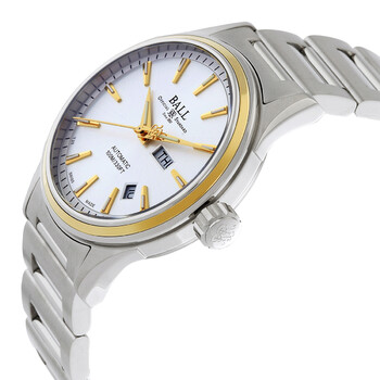 Two-tone (silver-tone and yellow gold-tone) stainless steel & 18kt yellow gold case and bracelet. Fixed gold-tone stainless steel & 18kt yellow gold bezel. Silver dial with gold-tone hands and index hour markers. Minute markers around the outer rim. Dial Type: Analog. Luminescent hands and markers. Day display at the 3 o'clock position.date display between 4 and 5 o'clock position. Automatic movement. Scratch resistant sapphire crystal. Screw down crown. Transparent see through case back. Round case shape, case size: 40 mm. Butterfly clasp. Water resistant at 100 meters / 330 feet. Functions: date, day, hour, minute, second. Fireman Series. Sport watch style. Watch label: Swiss Made. Ball Fireman Automatic Silver Dial Men's Watch NM2110C-SJ-SL.