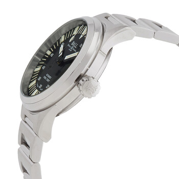 Silver-tone stainless steel case and bracelet. Fixed silver-tone stainless steel bezel. Black dial with black hands and index hour markers. Minute markers around the outer rim. Dial Type: Analog. Luminescent hands and markers. Date display at the 3 o'clock position. BALL Calibre RR1103 Automatic movement, based upon ETA 2824-2, containing 25 Jewels, bitting at 28800 vph, and has a power reserve of approximately 38 hours. Scratch resistant sapphire crystal. Solid case back. Round case shape, case size: 40 mm. Fold over clasp with a safety release. Water resistant at 100 meters / 330 feet. Functions: date, hour, minute, second. Fireman Series. Luxury watch style. Watch label: Swiss Made. Ball Fireman Night Train Automatic Black Dial Men's Watch NM2188C-S21-BK1.
