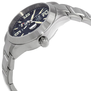 Silver-tone stainless steel case and bracelet. Fixed silver-tone stainless steel bezel. Blue dial with silver-tone hands and Arabic numeral & index hour markers. Minute markers around the outer rim. Dial Type: Analog. Luminescent hands and markers. Date display at the 3 o'clock position. Power reserve subdials. Ball Calibre RR1702-C Automatic movement, based upon ETA 2897, containing 21 Jewels, bitting at 28800 vph, and has a power reserve of approximately 42 hours. Scratch resistant sapphire crystal. Screw down crown. Solid case back. Round case shape, case size: 40 mm, case thickness: 13.75 mm. Fold over clasp. Water resistant at 30 meters / 100 feet. Functions: date, hour, minute, power reserve, second, shock resistant, water resistant. Pioneer Power Reserve Series. Sport watch style. Watch label: Swiss Made. Ball Pioneer Power Reserve Automatic Blue Dial Unisex Watch PM9026C-SCJ-BE.
