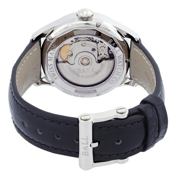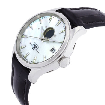 Silver-tone stainless steel case with a black leather strap. Fixed silver-tone stainless steel bezel. White mother of pearl dial with silver-tone hands and index hour markers. Minute markers around the outer rim. Dial Type: Analog. Luminescent hands and markers. Date display at the 3 o'clock position. One subdial displaying: moonphase. Ball Calibre RR1801 automatic movement. Scratch resistant sapphire crystal. Pull / push crown. Transparent case back. Round case shape, case size: 34 mm, case thickness: 12.05 mm. Water resistant at 50 meters / 165 feet. Functions: date, hour, minute, moon-phase, second. Trainmaster Series. Dress watch style. Watch label: Swiss Made. Ball Trainmaster Automatic White Mother of Pearl Dial Ladies Watch NL3082D-LJ-WH.