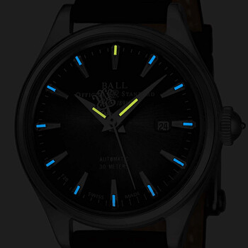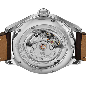 Silver-tone stainless steel case with a brown alligator leather strap. Stationary silver-tone stainless steel bezel. Black dial with silver-tone hands and index hour markers. Minute markers around the outer rim. Dial Type: Analog. Luminescent hands and markers. Date display window at the 3 o'clock position. Automatic movement with a 40-hour power reserve. Scratch resistant sapphire crystal. Sapphire case back. Round case shape, case size: 30 mm, case thickness: 10 mm. Band width: 14 mm, band length: 7 inches. Stainless steel clasp. Water resistant at 30 meters / 100 feet. Functions: date, hour, minute, second. Trainmaster eternity series. Casual watch style. Watch label: Swiss Made. Ball Trainmaster Eternity Automatic Black Dial Ladies Watch NL2080D-LJ-BK.
