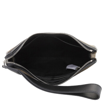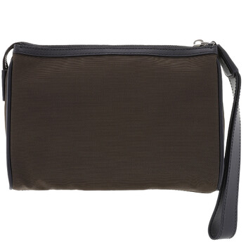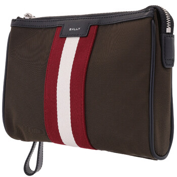 Brand: Bally. SKU: MAM00R-I679P. Color: Fango/Black/Pal. Size: W:23cm x H:17cm x D:4.5cm. Bally Logo-Tape Striped Clutch Bag. This clutch features a top zip fastening, stripe detailing, silver-tone logo lettering, a wrist strap, a main compartment, an internal logo patch, an internal card slot, and a full lining. 100% Fabric.