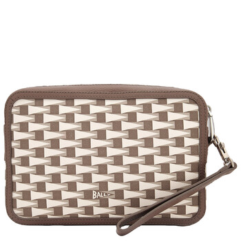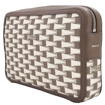 Brand: Bally. SKU: MAM00P-I8N0P. Material: Calfskin;Cotton;Polyester. Color: Brown. Size: W: 25cm x H:17cm x D:6cm. Bally Multi Deserto Oro Pennant Clutch. This accessory features a zippered closure, a lined interior with an open pocket and a zippered pocket, a detachable wrist handle, and gold-finished metalware, all highlighted by a clutch design with a pennant motif and leather trims. 45% Polyurethane, 25% Calfskin, 15% Cotton, 15% Polyester.