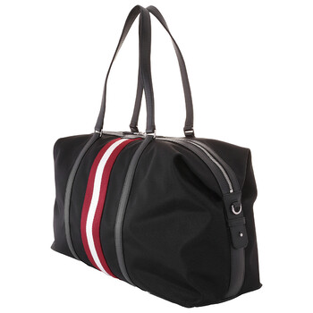 Bally Men's Duffle Bag. SKU: MAE03T-U901P. Color: Black/Palladio. Size: H: 13" x W: 19" x D: 7". Bally Nylon Code Weekend Duffle Bag. This black nylon weekend bag features a red and white Bally Ribbon detail, black leather trim, palladium metallic accents, and leather handles, with an adjustable, removable shoulder strap. It includes internal organization with a leather zippered pocket on the back panel, an open pocket on the front panel, side hooks for adjustment, a double zip closure, and a recycled nylon lining.