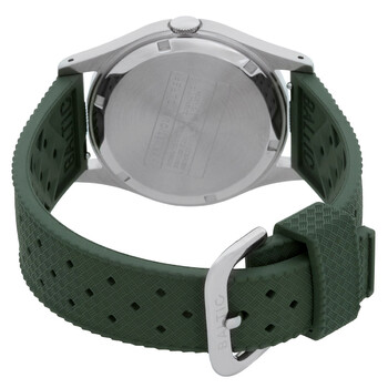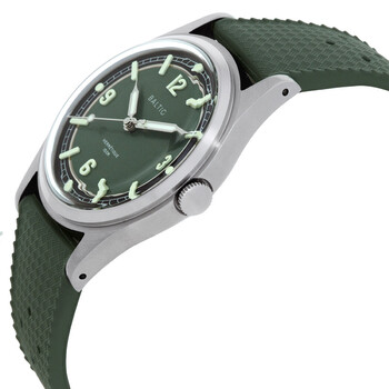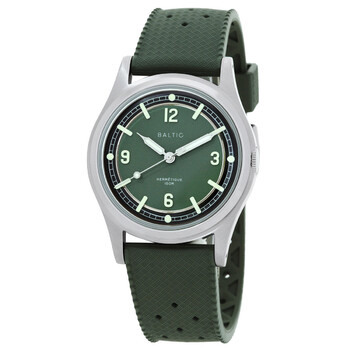 Silver-tone stainless steel case with a green tropic strap in vulcanized rubber. Fixed silver-tone stainless steel bezel. Green dial with silver-tone hands and Arabic numeral hour markers. Minute markers around the outer rim. Dial Type: Analog. Luminescent hands and markers. Automatic movement. Round case shape, case size: 37 mm. Water resistant at 150 meters / 500 feet. Functions: hour, minute, second. Hermetique Series. Casual watch style. Baltic Hermetique Automatic Green Dial Men's Watch HERMGREEN.