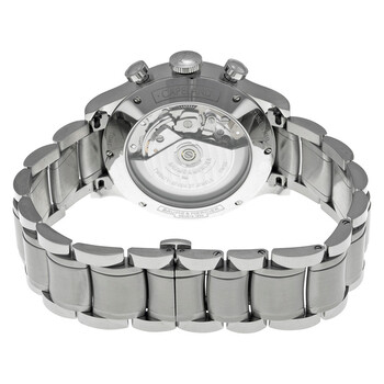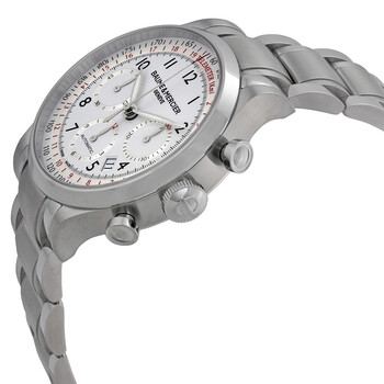 Silver-tone stainless steel case with a silver-tone stainless steel bracelet. Fixed silver-tone stainless steel bezel. White dial with luminous silver-tone hands and Arabic numeral hour markers. Minute markers. telemeter. tachymeter scale appears around the outer rim. Dial Type: Analog. Luminescent hands and markers. Date display between 4 and 5 o'clock position. Chronograph - three sub-dials displaying: 60 second, 30 minute and 12 hour. ETA-Valjoux Caliber 7753 automatic movement with a 44-hour power reserve. Scratch resistant sapphire, anti-glare treatment crystal. Pull / push crown. Transparent case back. Round case shape, case size: 42 mm, case thickness: 14.9 mm. Band width: 20 mm, band length: 8 inches. Deployment with push button release clasp. Water resistant at 50 meters / 165 feet. Functions: tachymeter, telemeter, chronograph, date, hour, minute, second. Casual watch style. Watch label: Swiss Made. Item Variations: MOA10061, M0A10061, 10061. Baume and Mercier Capeland Automatic Chronograph Men's Watch 10061.