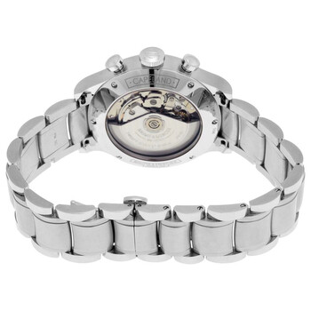 Stainless steel case with a stainless steel bracelet. Fixed stainless steel bezel. Black dial with luminous hands and Arabic numeral hour markers. Minute markers. Telemeter. Tachymeter scale appears around the outer rim. Dial Type: Analog. Luminescent hands and markers. Date display between 4 and 5 o'clock positions. Chronograph - three sub-dials displaying: 60 second, 30 minute and 12 hour. Automatic movement. Scratch resistant sapphire crystal. Pull / push crown. Skeleton case back. Case diameter: 42 mm. Case thickness: 16 mm. Round case shape. Deployment clasp with push button release. Water resistant at 50 meters / 165 feet. Functions: tachymeter, chronograph, date, hour, minute, second. Casual watch style. Watch label: Swiss Made. Item Variations: MOA10062, M0A10062, 10062. Baume and Mercier Capeland Black Dial Chronograph Men's Watch M0A10062.