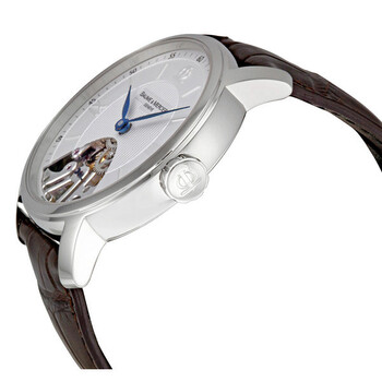 Stainless steel case with a brown alligator leather strap. Fixed stainless steel bezel. Silver-tone with skeletal display dial, blue steel hands and stick hour markers. Roman numerals mark the 3 and 9 o'clock positions. Minute markers around the outer rim. Manual movement. Scratch resistant sapphire crystal. Skeleton case back. Case diameter: 42 mm. Tang clasp. Water resistant at 30 meters / 100 feet. Functions: hours, minutes. Baume and Mercier Classima Executives Men's Watch 8786. Item Variations: MOA8786, M0A08786, 8786, 08786
