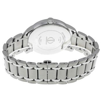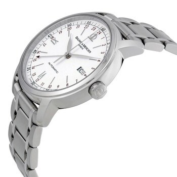 Stainless steel case with a stainless steel bracelet. Fixed stainless steel bezel. White dial with silver-tone hands and index hour markers. Roman numerals mark the 3, 6, and 9 o'clock positions. 24 hour markings. Minute markers around the outer rim. Dial Type: Analog. Date display appears at the 3 o'clock position. Automatic movement. Scratch resistant sapphire crystal. Solid case back. Case diameter: 41.8 mm. Case thickness: 9 mm. Round case shape. Band length: 7 inches. Deployment clasp with push button release. Water resistant at 30 meters / 100 feet. Functions: hours, minutes, seconds, date. Luxury watch style. Watch label: Swiss Made. Item Variations: MOA8734, M0A08734, 8734, 08734. Baume and Mercier Classima Executives XL Men's Watch M0A08734.