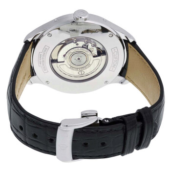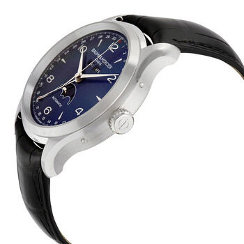 Stainless steel case with a black leather strap. Fixed stainless steel bezel. Metallic blue dial with silver-toned hands and alternating Arabic numeral and index hour markers. Minute markers. Date scale around the outer rim. Dial Type: Analog. Day of the week and month display below the 12 o'clock position. Moonphase at the 6 o'clock position. Dubois Depraz calibre 9000 automatic movement, based upon ETA 2892-A2, containing 25 Jewels, bitting at 28800 vph, and has a power reserve of approximately 42 hours. Scratch resistant sapphire crystal. Pull / push crown. Skeleton case back. Round case shape. Case size: 43 mm. Case thickness: 12.25 mm. Band width: 22.9 mm. Band length: 9 inches. Deployment clasp with a push button release. Water resistant at 50 meters / 165 feet. Functions: month, date, hour, minute, second, moonphase. Clifton Series. Luxury watch style. Watch label: Swiss Made. Item Variations: MOA10057, M0A10057, 10057. Baume and Mercier Clifton Blue Dial Moonphase Men's Watch 10057.