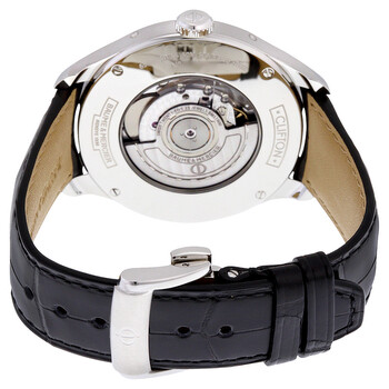 Silver-tone stainless steel case with a black leather strap. Fixed silver-tone stainless steel bezel. Silver dial with rose gold-tone hands and alternating Arabic numeral and index hour markers. Date scale around the outer rim. Dial Type: Analog. Day of the week and month display below the 12 o'clock position. Moonphase display above the 6 o'clock position subdials. Dubois Depraz Calibre 9000 Automatic movement, based upon ETA 2892-A2, containing 25 Jewels, bitting at 28800 vph, and has a power reserve of approximately 42 hours. Scratch resistant sapphire crystal. Pull / push crown. Skeleton case back. Round case shape, case size: 43 mm, case thickness: 12.25 mm. Band width: 22.9 mm, band length: 9 inches. Deployment with push button release clasp. Water resistant at 50 meters / 165 feet. Functions: month, date, hour, minute, second, moonphase. Clifton Series. Luxury watch style. Watch label: Swiss Made. Item Variations: MOA10055, M0A10055, 10055. Baume and Mercier Clifton Silver Dial Moonphase Black Alligator Leather Men's Watch 10055.