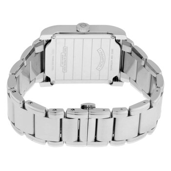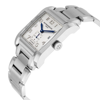 Stainless steel case with a stainless steel bracelet. Fixed stainless steel bezel. Silver dial with blue hands and Arabic numeral hour markers. Minute markers around the outer rim. Dial Type: Analog. Date display at the 3 o'clock position. Small seconds sub-dial at the 6 o'clock position. Automatic movement with a 42-hour power reserve. Scratch resistant sapphire crystal. Pull / push crown. Solid case back. Rectangle case shape. Case dimensions: 45 mm x 32 mm. Case thickness: 11 mm. Band width: 23 mm. Band length: 8 inches. Fold over clasp with a push button release. Water resistant at 50 meters / 165 feet. Functions: date, hour, minute, second. Hampton Series. Dress watch style. Watch label: Swiss Made. Item Variations: MOA10047, M0A10047, 10047. Baume and Mercier Hampton Automatic Silver Dial Men's Watch 10047.
