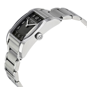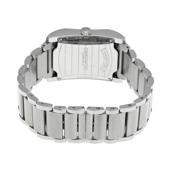 Stainless steel case with a stainless steel bracelet. Fixed stainless steel bezel. Black dial with luminous hands and Arabic numeral hour markers. Minute markers around the outer rim. Dial Type: Analog. Date display at the 3 o'clock position. Quartz movement. Scratch resistant sapphire crystal. Pull / push crown. Solid case back. Case dimensions: 27 mm x 40 mm. Case thickness: 10.2 mm. Rectangle case shape. Band width: 21.5 mm. Band length: 7 inches. Hidden fold over clasp. Water resistant at 50 meters / 165 feet. Functions: date, hour, minute. Casual watch style. Watch label: Swiss Made. Item Variations: MOA10021, M0A10021, 10021. Baume and Mercier Hampton Black Dial Stainless Steel Ladies Watch 10021.