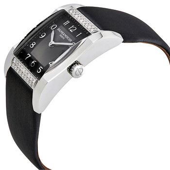 Stainless steel case with a black satin (leather backed) strap. Fixed stainless steel bezel set with diamonds. Opaline black dial with silver-tone hands and Arabic numeral hour markers. Minute markers around the outer rim. Dial Type: Analog. Luminescent hands and markers. Date display at the 3 o'clock position. Quartz movement. Scratch resistant sapphire crystal. Pull / push crown. Solid case back. Case dimensions: 31.65 mm x 27.5 mm. Rectangle case shape. Fold over clasp with a safety release. Water resistant at 50 meters / 165 feet. Functions: date, hour, minute, second. Dress watch style. Watch label: Swiss Made. Item Variations: MOA10024, M0A10024, 10024. Baume and Mercier Hampton Milleis Opaline Black Dial Ladies Watch M0A10024.