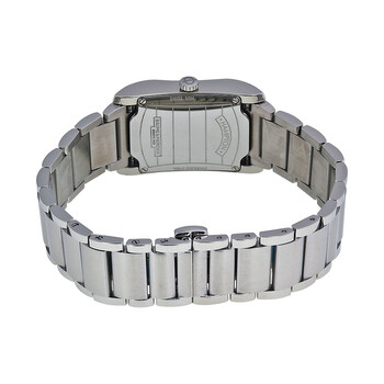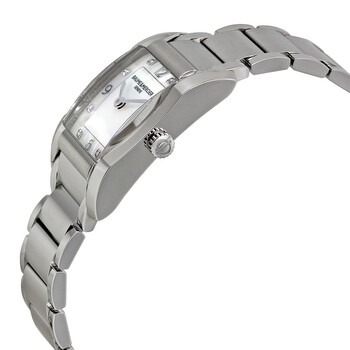 Stainless steel case with a stainless steel bracelet. Fixed stainless steel bezel. Mother of pearl dial with silver-tone hands and diamond hour markers. Arabic numerals mark the 6, 9 and 12 o'clock positions. Dial Type: Analog. Date display at the 3 o'clock position. Quartz movement. Scratch resistant sapphire crystal. Pull / push crown. Solid case back. Case dimensions: 22 mm x 35 mm. Case thickness: 9 mm. Rectangle case shape. Band width: 21 mm. Band length: 7 inches. Fold over clasp with a push button release. Water resistant at 50 meters / 165 feet. Functions: date, hour, minute, second. Casual watch style. Watch label: Swiss Made. Baume and Mercier Hampton Mother of Pearl Diamond Dial Ladies Watch M0A10050. Item Variations: MOA10050, M0A10050, 10050