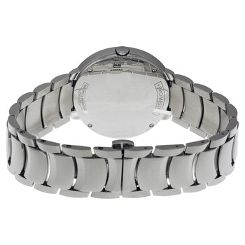 Silver-tone stainless steel case with a silver-tone stainless steel bracelet. Fixed silver-tone mother of pearl set with 61 diamonds bezel. Silver dial with silver-tone dauphine rhodium-plated hands and diamond hour markers. Roman numerals mark the 3, 6, 9 and 12 o'clock positions. Dial Type: Analog. ETA Caliber F05.101 quartz movement. Scratch resistant sapphire crystal. Pull / push crown. Solid case back. Round case shape. Case size: 34 mm. Deployment clasp. Water resistant at 30 meters / 100 feet. Functions: hour, minute. Dress watch style. Watch label: Swiss Made. Baume and Mercier Promesse Silver Dial Stainless Steel Ladies Watch 10199.