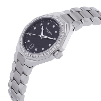 Stainless steel case with a stainless steel bracelet. Diamond accent bezel. with silver-tone hands and diamond hour markers. Minute markers around the outer rim. Date display appears at the 6 o'clock position. Quartz movement. Scratch resistant sapphire crystal. Case diameter: 28 mm. Deployment clasp. Water resistant at 50 meters/ 165 feet. Functions: hours, minutes, seconds, calendar. Baume and Mercier Riviera Stainless Steel Ladies Watch MOA8716. Item Variations: MOA8716, M0A08716, 8716, 08716