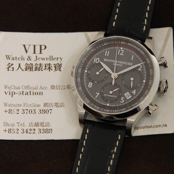 Silver-tone stainless steel case with a black alligator leather strap. Fixed silver-tone stainless steel bezel. Black dial with silver-tone hands and Arabic numeral hour markers. Tachymeter scale around the outer rim. Dial Type: Analog. Date display between 4 and 5 o'clock position. Automatic movement. Scratch resistant sapphire crystal. Solid case back. Round case shape, case size: 42 mm. Functions: chronograph, date, hour, minute, second. Additional Info: original box, international warranty card, manual (complete accessories). Capeland Series. Luxury watch style. Watch label: Swiss Made. Baume et Mercier Capeland Chronograph Automatic Black Dial Unisex Watch M0A10044.