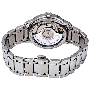 Stainless steel case with a stainless steel bracelet. Fixed stainless steel bezel. Silver dial with silver-tone leaf-style hands and index hour markers. Roman numerals mark the 3, 6, 9 and 12 o'clock positions. Minute markers around the outer rim. Dial Type: Analog. Date display at the 3 o'clock position. ETA caliber 2892-A2 automatic movement, based upon ETA 2890, containing 21 Jewels, bitting at 28800 vph, and has a power reserve of approximately 42 hours. Scratch resistant sapphire crystal. Pull / push crown. Transparent case back. Round case shape. Case size: 34 mm. Case thickness: 8.15 mm. Triple fold over clasp with a push button release. Water resistant at 50 meters / 165 feet. Functions: date, hour, minute, second. Classima Series. Casual watch style. Watch label: Swiss Made. Baume et Mercier Classima Automatic Silver Dial Ladies Watch 10495.
