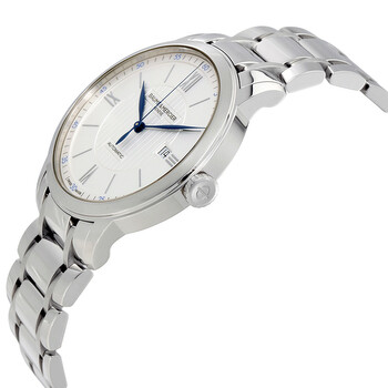 Stainless steel case with a stainless steel bracelet. Fixed stainless steel bezel. Silver dial with blue leaf-style hands and index hour markers. Roman numerals appear at the 3, 6, 9 and 12 o'clock positions. Arabic numeral minute markers (at 5 minute intervals). Minute markers around the outer rim. Dial Type: Analog. Date display at the 3 o'clock position. Sellita caliber SW200 automatic movement, containing 26 Jewels, bitting at 28800 vph, and has a power reserve of approximately 38 hours. Scratch resistant sapphire crystal. Pull / push crown. Transparent case back. Round case shape. Case size: 42 mm. Case thickness: 8.95 mm. Band width: 22 mm. Triple fold over clasp. Water resistant at 50 meters / 165 feet. Functions: date, hour, minute, second. Classima Series. Luxury watch style. Watch label: Swiss Made. Item Variations: A10334, 10334. Baume et Mercier Classima Automatic Silver Dial Men's Watch MOA10334.