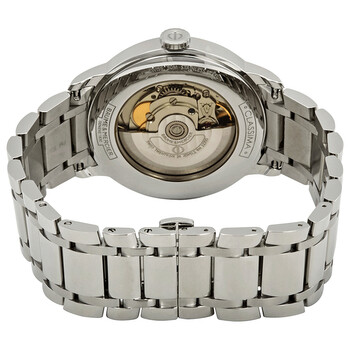 Stainless steel case with a stainless steel bracelet. Fixed stainless steel bezel. Silver dial with rose gold-tone leaf-style hands and index hour markers. Roman numerals mark the 3, 6, 9 and 12 o'clock positions. Arabic numeral minute markers (at 5 minute intervals). Minute markers around the outer rim. Dial Type: Analog. Date display at the 3 o'clock position. Sellita caliber SW200 automatic movement, containing 26 Jewels, bitting at 28800 vph, and has a power reserve of approximately 38 hours. Scratch resistant sapphire crystal. Pull / push crown. Transparent case back. Round case shape. Case size: 40 mm. Case thickness: 8.95 mm. Band width: 22 mm. Fold over clasp with a push button release. Water resistant at 50 meters / 165 feet. Functions: date, hour, minute, second. Classima Series. Casual watch style. Watch label: Swiss Made. Baume et Mercier Classima Automatic Silver Dial Men's Watch 10374.