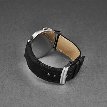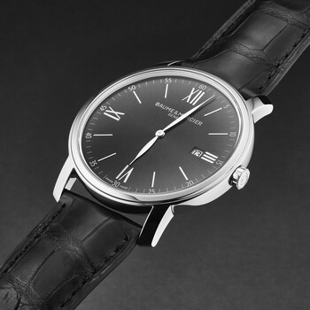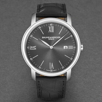 Stainless steel case with a black leather strap. Fixed silver-tone stainless steel bezel. Grey dial with Roman numeral & index hour markers. Dial Type: Analog. Date display at the 3 o'clock position. Quartz (ETA F06.111) quartz movement. Scratch resistant sapphire crystal. Pull / push crown. Solid case back. Round case shape, case size: 42 mm, case thickness: 6 mm. Band width: 22 mm, band length: 8 inches. Tang clasp. Water resistant at 30 meters / 100 feet. Additional Info: hours, minutes, date. Classima Series. Luxury watch style. Baume et Mercier Classima Grey Dial Men's Watch M0A10191.