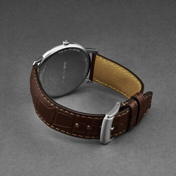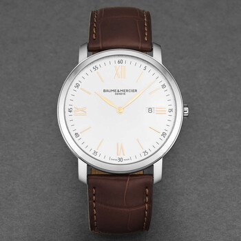 Silver-tone stainless steel case with a brown leather strap. Fixed silver-tone stainless steel bezel. Silver dial with rose gold-tone hands and index-Roman numeral hour markers. Dial Type: Analog. Date display at the 3 o'clock position. Quartz movement. Scratch resistant sapphire crystal. Pull / push crown. Solid case back. Round case shape, case size: 39 mm, case thickness: 5.5 mm. Band width: 20 mm. Buckle clasp. Water resistant at 50 meters / 165 feet. Functions: date, hour, minute, second. Classima Series. Casual watch style. Watch label: Swiss Made. Baume et Mercier Classima Quartz Silver Dial Men's Watch M0A10128.