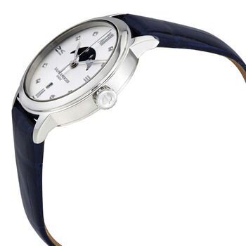Stainless steel case with a blue leather strap. Fixed stainless steel bezel. Silver dial with silver-tone rhodium-plated leaf-style hands and diamond hour markers. Roman numerals mark the 3, 6, 9 and 12 o'clock positions. Dial Type: Analog. Date display above the 6 o'clock position. Moonphase display. Ronda caliber 788 quartz movement. Scratch resistant sapphire crystal. Pull / push crown. Solid case back. Round case shape. Case size: 31.5 mm. Case thickness: 7.1 mm. Fold over clasp with a safety release. Water resistant at 50 meters / 165 feet. Functions: date, hour, minute, second, moonphase. Classima Series. Casual watch style. Watch label: Swiss Made. Baume et Mercier Classima Silver Dial Ladies Watch MOA10329.