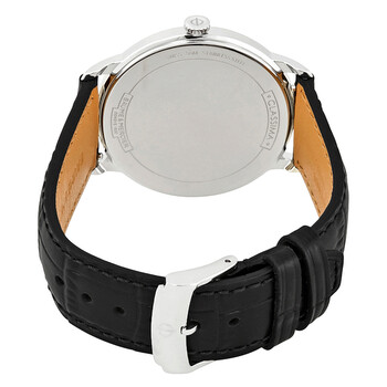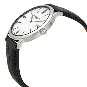 Stainless steel case with a black leather strap. Fixed stainless steel bezel. White dial with silver-tone rhodium-plated leaf-style hands and index hour markers. Roman numerals mark the 3, 6, 9 and 12 o'clock positions. Minute markers around the outer rim. Dial Type: Analog. Luminescent hands and markers. Date display at the 3 o'clock position. ETA caliber F06.111 quartz movement. Scratch resistant sapphire crystal. Pull / push crown. Solid case back. Round case shape. Case size: 40 mm. Case thickness: 7 mm. Band width: 21 mm. Band length: 7.5 inches. Tang clasp. Water resistant at 50 meters / 165 feet. Functions: date, hour, minute. Casual watch style. Watch label: Swiss Made. Baume et Mercier Classima White Dial 40mm Men's Watch 10323.