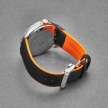 Stainless steel case with a black (orange back) leather strap. Fixed stainless steel bezel with a rose gold cap ring. Black dial with luminous rose gold-tone hands and index hour markers. Minute markers around the outer rim. Dial Type: Analog. Luminescent hands and markers. Date display at the 3 o'clock position. Automatic movement. Scratch resistant sapphire crystal. Solid case back. Round case shape. Case size: 42 mm. Band width: 22 mm. Deployment clasp. Water resistant at 100 meters / 330 feet. Functions: date, hour, minute, second. Clifton Series. Dress watch style. Watch label: Swiss Made. Baume et Mercier Clifton Automatic Black Dial Men's Watch A10424.
