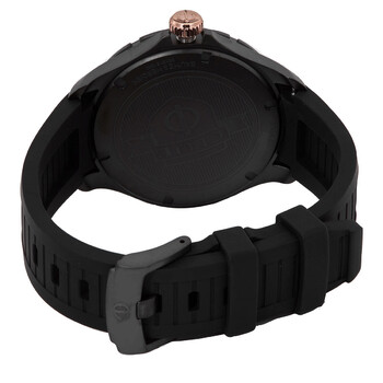 Black-plated stainless steel case with a black rubber strap. Uni-directional rotating 18kt rose gold bezel. Black dial with luminous black hands and index hour markers. Minute markers around the outer rim. Dial Type: Analog. Luminescent hands. Date display at the 3 o'clock position. Automatic movement. Scratch resistant sapphire crystal. Screw down crown. Solid case back. Round case shape. Case size: 42 mm. Case thickness: 11 mm. Band width: 20 mm. Tang clasp. Water resistant at 100 meters / 330 feet. Functions: date, hour, minute, second. Casual watch style. Watch label: Swiss Made. Baume et Mercier Clifton Automatic Black Dial Men's Watch M0A10425.