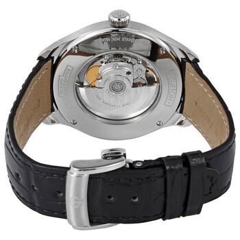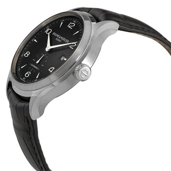 Silver-tone stainless steel case with a black leather strap. Fixed silver-tone stainless steel bezel. Black dial with silver-tone hands and Arabic numeral hour markers. Minute markers around the outer rim. Dial Type: Analog. Date display at the 3 o'clock position. One subdial displaying: small second. Automatic movement. Scratch resistant sapphire crystal. Pull / push crown. Transparent see through case back. Round case shape, case size: 41 mm. Buckle clasp. Functions: date, hour, minute, second. Clifton Series. Dress watch style. Baume et Mercier Clifton Automatic Black Dial Men's Watch M0A65717.