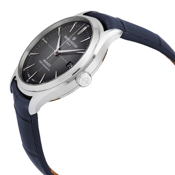 Stainless steel case with a blue (alligator) leather strap. Fixed stainless steel bezel. Grey dial with rhodium-plated hands and index hour markers. Minute markers. Arabic numeral minute markers (at 5 minute intervals) around the outer rim. Dial Type: Analog. Date display at the 3 o'clock position. BM13-1975A COSC automatic movement with a 120-hour power reserve. Scratch resistant sapphire crystal. Screw down crown. Transparent case back. Round case shape. Case size: 40 mm. Case thickness: 11.3 mm. Triple fold over clasp. Water resistant at 50 meters / 165 feet. Functions: date, hour, minute, second. Clifton Series. Dress watch style. Watch label: Swiss Made. Baume et Mercier Clifton Automatic Grey Dial Men's Watch 10550.