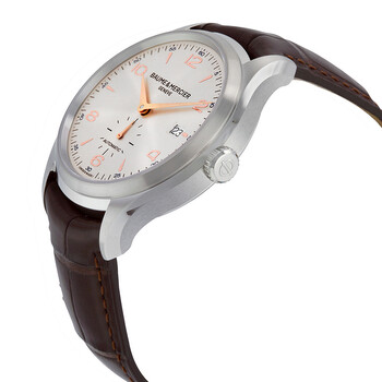 Stainless steel case with a brown (alligator) leather strap. Fixed stainless steel bezel. Silver (sun brushed) dial with rose gold-tone hands and alternating Arabic numeral and index hour markers. Minute markers around the outer rim. Dial Type: Analog. Date display at the 3 o'clock position. Seconds sub-dial at the 6 o'clock position. Sellita caliber SW260-1 automatic movement with a 38-hour power reserve. Scratch resistant sapphire crystal. Pull / push crown. Skeleton case back. Round case shape. Case size: 41 mm. Case thickness: 11.54 mm. Band width: 22.9 mm. Band length: 9 inches. Deployment clasp. Water resistant at 50 meters / 165 feet. Functions: date, hour, minute, second. Dress watch style. Watch label: Swiss Made. Item Variations: MOA10054, M0A10054, 10054. Baume et Mercier Clifton Automatic Men's Watch A10054.