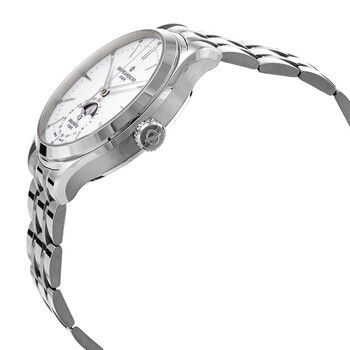 Silver-tone stainless steel case and bracelet. Fixed silver-tone stainless steel bezel. White dial with rhodium-plated hands and index hour markers. Minute markers. Arabic numeral minute markers (at 5 minute intervals) around the outer rim. Dial Type: Analog. Date / moon phase subdials. Baumatic BM14-1975A C1 automatic movement. Scratch resistant sapphire crystal. Transparent case back. Round case shape, case size: 42 mm, case thickness: 13.2 mm. Triple fold over clasp. Water resistant at 50 meters / 165 feet. Functions: date, hour, minute, second. Clifton Series. Dress watch style. Watch label: Swiss Made. Baume et Mercier Clifton Automatic White Dial Men's Watch 10552.