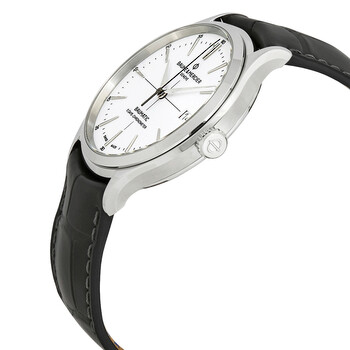 Stainless steel case with a black (alligator) leather strap. Fixed stainless steel bezel. White dial with silver-tone hands and index hour markers. Minute markers. Arabic numeral minute markers (at 5 minute intervals) around the outer rim. Dial Type: Analog. Date display at the 3 o'clock position. Baume et Mercier calibre BM12-1975A automatic movement, based upon Baume & Mercier BM12-1975M, containing 21 Jewels, bitting at 28800 vph, and has a power reserve of approximately 120 hours. Scratch resistant sapphire crystal. Pull / push crown. Transparent case back. Round case shape. Case size: 40 mm. Case thickness: 10.3 mm. Band width: 20 mm. Tang clasp. Water resistant at 50 meters / 165 feet. Functions: date, hour, minute, second, 5 day chronometer. Clifton Baumatic Series. Dress watch style. Watch label: Swiss Made. Baume et Mercier Clifton Baumatic 5 Day Chronometer Automatic White Dial Men's Watch 10436.