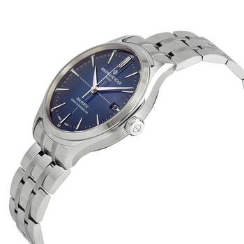 Stainless steel case with a stainless steel and bracelet. Fixed stainless steel bezel. Blue dial with silver-tone hands and index hour markers. Minute markers around the outer rim. Dial Type: Analog. Date display at the 3 o'clock position. Baumatic calibre BM13-1975A COSC automatic movement with a 120-hour power reserve. Scratch resistant sapphire crystal. Transparent case back. Round case shape. Case size: 40 mm. Case thickness: 11.1 mm. Bracelet width: 20 mm. Fold over clasp with a push button release. Water resistant at 50 meters / 165 feet. Functions: date, hour, minute, second, chronometer. Clifton Baumatic Series. Casual watch style. Watch label: Swiss Made. Baume et Mercier Clifton Baumatic Automatic Chronometer Blue Dial Men's Watch 10468.