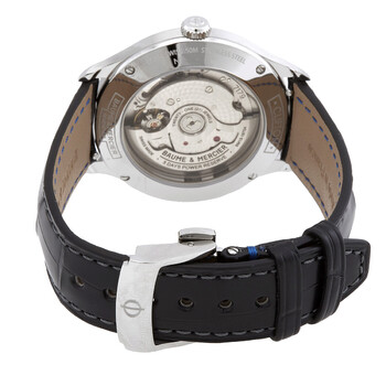 Stainless steel case with a black (alligator) leather strap. Fixed stainless steel bezel. White dial with silver-tone hands and index hour markers. Minute markers around the outer rim. Dial Type: Analog. Date display at the 3 o'clock position. Baume et Mercier calibre BM13-1975A COSC automatic movement, containing 21 Jewels, bitting at 28800 vph, and has a power reserve of approximately 120 hours. Scratch resistant sapphire crystal. Pull / push crown. Transparent case back. Round case shape. Case size: 40 mm. Case thickness: 11.1 mm. Strap width: 20 mm. Fold over clasp. Water resistant at 50 meters / 165 feet. Functions: date, hour, minute, second. Luxury watch style. Watch label: Swiss Made. Baume et Mercier Clifton Baumatic Automatic Men's Black Leather Watch 10518.