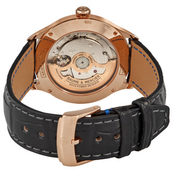 18kt rose gold case with a black (alligator) leather strap. Fixed 18kt rose gold bezel. White dial with rose gold hands and index hour markers. Minute markers around the outer rim. Dial Type: Analog. Date display at the 3 o'clock position. Baumatic BM13-1975A COSC automatic movement with a 120-hour power reserve. Scratch resistant sapphire crystal. Pull / push crown. Transparent case back. Round case shape. Case size: 38.8 mm. Case thickness: 10.74 mm. Band width: 22 mm. Tang clasp. Water resistant at 50 meters / 165 feet. Functions: date, hour, minute, second. Clifton Baumatic Series. Luxury watch style. Watch label: Swiss Made. Baume et Mercier Clifton Baumatic Automatic White Dial Men's Watch M0A10469.