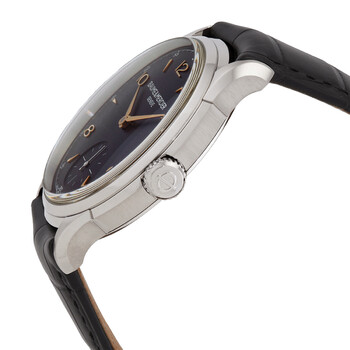 Movement: Manual winding Charge: 56 hours Dial: Black Indicators: Arabic numbers and indices Case: Steel Dimension: 45 mm Bracelet / Strap: Black alligator skin Impermeability: 50 meters Glass: Sapphire with anti-reflective treatment Genre: Man Swiss watch with manual winding 45 mm in diameter, with its elegant aesthetic the Clifton 10364 is perfect for the modern gentleman. This model features an opal black dial and a discreet small seconds counter at 6 o'clock, which counteracts the elegance of the Arabic numerals and golden hour markers. It also features refined 18-karat rose gold hands. The case is made of steel with a glossy-satin finish, while the sapphire caseback allows you to admire the movement of the watch. Perfectly matched to the black dial, the premium quality black alligator leather strap completes the urban look of this luxurious men's watch. The strap is equipped with a pin buckle with a glossy-satin finish.