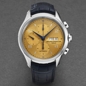 Silver-tone stainless steel case with a blue leather strap. Fixed silver-tone stainless steel bezel. Champagne dial with blue hands and Arabic numeral & index hour markers. Minute markers around the outer rim. Dial Type: Analog. Day / date. Automatic movement. Scratch resistant sapphire crystal. Pull / push crown. Transparent case back. Round case shape, case size: 43 mm, case thickness: 14.95 mm. Band width: 21 mm, band length: 8 inches. Deployment with push button release clasp. Water resistant at 50 meters / 165 feet. Functions: chronograph, day, date, hour, minute, second. Additional Info: hours, minutes, small seconds, day-date, chronograph. Clifton Series. Luxury watch style. Watch label: Swiss Made. Baume et Mercier Clifton Chronograph Automatic Champagne Dial Men's Watch M0A10240.