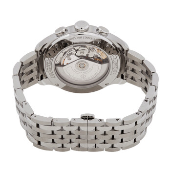 Silver-tone stainless steel case and bracelet. Fixed silver-tone stainless steel bezel. Champagne dial with blue hands and Arabic numeral & index hour markers. Minute markers around the outer rim. Dial Type: Analog. Date display at the 3 o'clock position. Chronograph - three sub-dials displaying: 60 second, 30 minute and 12 hour. ETA-Valjoux Caliber 7750 Automatic movement, containing 25 Jewels, bitting at 28800 vph, and has a power reserve of approximately 44 hours. Scratch resistant sapphire crystal. Pull / push crown. Transparent case back. Round case shape, case size: 43 mm, case thickness: 14.9 mm. Band width: 21 mm, band length: 8 inches. Deployment with push button release clasp. Water resistant at 50 meters / 165 feet. Functions: chronograph, date, day, hour, minute, second. Additional Info: hours, minutes, small seconds, day-date, chronograph. Clifton Series. Luxury watch style. Watch label: Swiss Made. Baume et Mercier Clifton Chronograph Automatic Champagne Dial Men's Watch M0A10241.