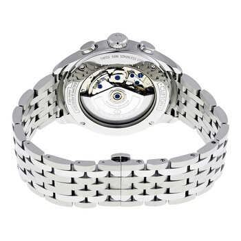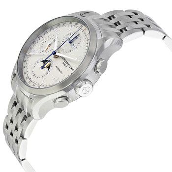 Stainless steel case with a stainless steel bracelet. Fixed stainless steel bezel. Silver dial with silver-tone hands and index and Arabic numeral hour markers. Minute markers. Date scale around the outer rim. Dial Type: Analog. Annual calendar - day of the week and month display below the 12 o'clock position. Chronograph - three sub-dials displaying: 30 minutes, 12 hours / moonphase, and 24 hours. ETA-Valjoux caliber 7751 automatic movement with a 48-hour power reserve. Scratch resistant sapphire crystal. Pull / push crown. Transparent case back. Round case shape, case size: 43 mm, case thickness: 10 mm. Band width: 20 mm. Fold over with push button release clasp. Water resistant at 50 meters / 165 feet. Functions: chronograph, month, date, day, hour, minute, second, moonphase, GMT, second time zone. Luxury watch style. Watch label: Swiss Made. Baume et Mercier Clifton Chronograph Automatic Men's Watch 10328.