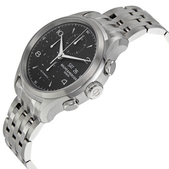Stainless steel case with a stainless steel bracelet. Fixed stainless steel bezel. Black dial with silver-tone hands and Arabic numeral and index hour markers. Minute markers around the outer rim. Dial Type: Analog. Day of the week and date display at the 3 o'clock position. Chronograph - three sub-dials displaying: 60 second, 30 minute and 12 hour. Automatic movement with a 48-hour power reserve. Scratch resistant sapphire crystal. Pull / push crown. Transparent case back. Round case shape. Case size: 43 mm. Case thickness: 14.95 mm. Band width: 17.8 mm. Band length: 7 inches. Deployment clasp with a push button release. Water resistant at 50 meters / 165 feet. Functions: power reserve 48 hours. Dress watch style. Watch label: Swiss Made. Baume et Mercier Clifton Chronograph Black Dial Men's Watch MOA10212.