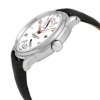 Stainless steel case with a black (alligator) leather strap. Fixed stainless steel bezel. White dial with rose gold-tone hands and alternating Arabic numeral and index hour markers. Minute markers around the outer rim. Dial Type: Analog. Date display at the 3 o'clock position. Two sub-dials displaying: 24 hour (dual time) and power reserve indicator. Soprod calibre 9035 automatic movement, based upon ETA 2892-A2, containing 21 Jewels, bitting at 28800 vph, and has a power reserve of approximately 42 hours. Scratch resistant sapphire crystal. Pull / push crown. Transparent case back. Round case shape. Case size: 45.5 mm. Case thickness: 12.45 mm. Band width: 20 mm. Tang clasp. Water resistant at 50 meters / 165 feet. Functions: GMT, second time zone, hour, minute, second, date. Clifton Series. Casual watch style. Watch label: Swiss Made. Baume et Mercier Clifton GMT Automatic Power Reserve White Dial Men's Watch 10421.