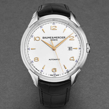 Silver-tone stainless steel case with a black leather strap. Fixed silver-tone stainless steel bezel. White dial with Arabic numeral & index hour markers. Dial Type: Analog. Date display at the 3 o'clock position. SW 200 movement hand wind movement. Scratch resistant sapphire crystal. Pull / push crown. Solid case back. Round case shape, case size: 45 mm, case thickness: 12 mm. Band width: 22 mm, band length: 8 inches. Tang clasp. Water resistant at 50 meters / 165 feet. Additional Info: hours, minutes, seconds, date. Clifton Series. Luxury watch style. Baume et Mercier Clifton White Dial Men's Watch M0A10365.